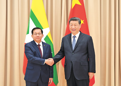 習(xí)近平指出,中緬是同甘共苦、守望相助的命運(yùn)共同體。中緬兩國共同倡導(dǎo)的和平共處五項(xiàng)原則和萬隆精神歷久彌堅(jiān),時(shí)代價(jià)值不斷凸顯。今年是兩國建交75周年,中方將秉持睦鄰、安鄰、富鄰、親誠惠容、命運(yùn)與共的理念方針,同緬方深化命運(yùn)共同體建設(shè),高質(zhì)量共建“一帶一路”,落實(shí)好全球發(fā)展倡議、全球安全倡議、全球文明倡議,給兩國人民帶來更多福祉。前不久,緬甸曼德勒強(qiáng)烈地震造成重大人員傷亡和財(cái)產(chǎn)損失,中方最早派出救援力量,援助緊急人道主義物資,愿繼續(xù)提供幫助,支持緬方重建家園。中方支持緬甸走符合本國國情的發(fā)展道路,維護(hù)主權(quán)獨(dú)立、領(lǐng)土完整、國家穩(wěn)定,穩(wěn)妥推進(jìn)國內(nèi)政治議程。雙方要深化戰(zhàn)略合作,持續(xù)推進(jìn)中緬經(jīng)濟(jì)走廊重點(diǎn)項(xiàng)目建設(shè)。希望緬方切實(shí)保障在緬中方人員、機(jī)構(gòu)、項(xiàng)目安全,加力打擊網(wǎng)賭電詐等跨境犯罪。雙方要共同捍衛(wèi)以聯(lián)合國為核心的國際體系和以國際法為基礎(chǔ)的國際秩序,維護(hù)發(fā)展中國家正當(dāng)權(quán)益。