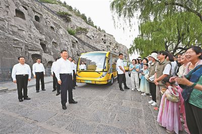 已有1500多年歷史的龍門石窟,是重要的世界文化遺產。習近平來到這里,察看石窟整體布局風貌和代表性窟龕、造像,同現(xiàn)場的文物保護工作者親切交流。他強調,要把這些中華文化瑰寶保護好、傳承好、傳播好。游客們見到總書記,都十分欣喜,紛紛向總書記問好。習近平不時同大家交流,特別鼓勵小朋友們多到實地尋溯中華文化,從小樹立文化自信。他指出,文旅融合前景廣闊,要推動文旅產業(yè)高質量發(fā)展,真正打造成為支柱產業(yè)、民生產業(yè)、幸福產業(yè)。