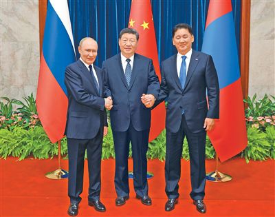 九月二日上午,國家主席習(xí)近平同俄羅斯總統(tǒng)普京、蒙古國總統(tǒng)呼日勒蘇赫在北京人民大會堂舉行中俄蒙三國元首第七次會晤。