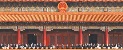 大會(huì)開始前,習(xí)近平和夫人彭麗媛在端門外廣場(chǎng)迎接出席大會(huì)的外方代表團(tuán)團(tuán)長及其配偶,并同他們合影留念。