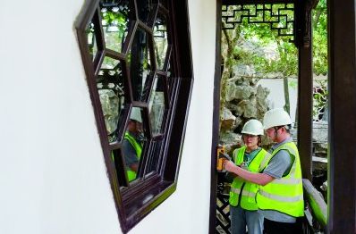 工作人員在蘇州獅子林采集園林建筑信息數(shù)據(jù),構(gòu)建蘇州古典園林要素數(shù)據(jù)庫。新華社發(fā)