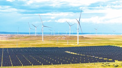 新疆阿勒泰地區(qū),由太陽能光伏板匯聚成“藍(lán)色海洋”,由風(fēng)力發(fā)電機(jī)組成“白色森林”,孕育著無限“風(fēng)光”。新華社發(fā)