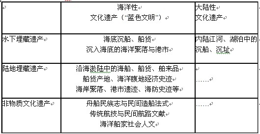 需要說(shuō)明的是,“海洋文化遺產(chǎn)”的認(rèn)知與“水下文化遺產(chǎn)”是截然不同的。海洋文化遺產(chǎn)是從人類文化行為的源頭上去把握遺產(chǎn)的內(nèi)涵與性質(zhì),是基于文化遺產(chǎn)研究與文化史認(rèn)知的學(xué)術(shù)角度。水下文化遺產(chǎn)是從埋藏形態(tài)上考察遺產(chǎn)的內(nèi)涵與性質(zhì),是基于文化遺產(chǎn)保護(hù)工作的便利(附表一)。