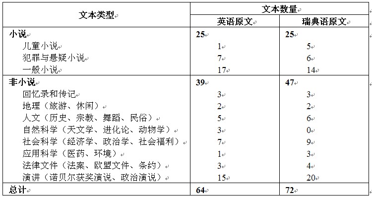 小說(shuō)文本又分為兒童小說(shuō)、犯罪與懸疑小說(shuō)和一般小說(shuō)三類,非小說(shuō)類又包括回憶錄與傳記等8類,若干子類,幾乎涵蓋了各個(gè)領(lǐng)域的文本,有利于開展特定文本或?qū)iT用途文本的語(yǔ)言與翻譯研究。ESPC基礎(chǔ)上的研究,除大量的語(yǔ)言對(duì)比分析外,與翻譯相關(guān)的研究涉及翻譯體、附加疑問句、被動(dòng)語(yǔ)態(tài)、動(dòng)詞熟語(yǔ)、分裂句、定式與非定式結(jié)構(gòu)等的語(yǔ)際轉(zhuǎn)換考察(如Aijmer 2001;Axelsson 2006;Fredriksson 2006;Gustawsson 2006;Johansson 2001,2002;Ruin 2001等)。