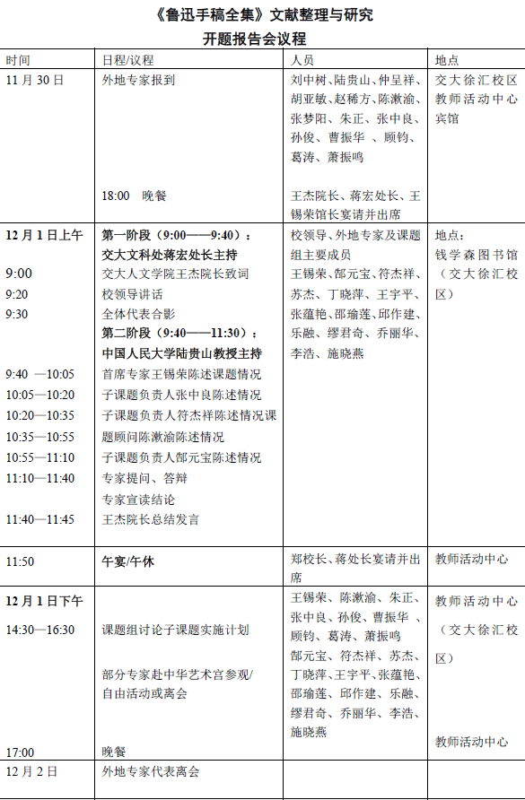 【上海交通大學(xué)網(wǎng)站】國家社科基金重大項目 “《魯迅手稿全集》文獻整理與研究”開題報告會暨項目啟動儀式于12月1日上午在上海交通大學(xué)徐匯校區(qū)錢學(xué)森圖書館舉行。全國哲學(xué)社會科學(xué)基金有關(guān)評審專家、來自中國社科院、國家圖書館、北京魯迅博物館、上海魯迅紀念館、復(fù)旦大學(xué)、華東師范大學(xué)等科研單位的多位專家學(xué)者,上海交通大學(xué)黨委常委李建強、文科處處長蔣宏、人文學(xué)院院長王杰,各子課題負責(zé)人、核心成員代表出席了會議。