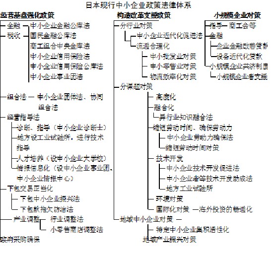 本子課題重點開展國內(nèi)外中小企業(yè)政策文本收集,分類與整理工作,按照政策內(nèi)容的劃分。先后收集國外中小企業(yè)政策文件,包括,國外政策數(shù)據(jù)主要通過查閱北美(美國)、東亞(日本、韓國)、西歐(德國、荷蘭、英國、意大利等)、南美(巴西、阿根廷等)、拉美(哥斯達(dá)黎加、墨西哥等)、澳洲(澳大利亞)等區(qū)域重點國家的中小企業(yè)管理部門的官方網(wǎng)站,以及聯(lián)合國、OECD、世界銀行等國際組織的有關(guān)政策研究報告等資料。歸納總結(jié)了日本等國家的中小企業(yè)政策體系(如下圖),比較分析臺灣省中小企業(yè)政策。完成了臺灣省中小企業(yè)輔導(dǎo)政策體系,臺灣省中小企業(yè)育成中心,美日中小企業(yè)創(chuàng)業(yè)環(huán)境比較,美日中小企業(yè)服務(wù)機(jī)構(gòu)與職能,金磚國家中小企業(yè)發(fā)展現(xiàn)狀等等文章。