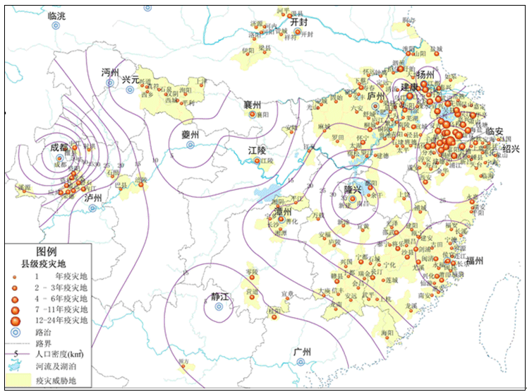 (3)分析方法創(chuàng)新性問題。關于疫災地理分布和環(huán)境機理的研究,傳統(tǒng)方法多采用文獻分析和定性描述的方法,存在學科交叉不夠、定量分析不夠、結論精度不夠的問題。為解決這個問題,我們嘗試采用了以下舉措:一是將定性指標定量化,引入疫災指數(shù)、疫災頻度、疫災廣度、疫災厚度、疫災密度等概念,在不能獲得每次、每年疫災的受災人口的情況下,以縣域為單位,利用GIS技術將疫災威脅的國土面積進行空間統(tǒng)計分析,用以比較判斷一年或十年甚至一個歷史階段的疫災的頻繁程度和災害強度;二是將空間自相關方法、疫災頻度等值線方法引入疫災地理分布特點及其變化規(guī)律的研究,揭示疫災的空間差異及其與人口分布的關系;三是將相關分析、回歸分析、因子分析等數(shù)理統(tǒng)計方法引入歷史疫災環(huán)境機理的研究,分析影響疫災流行與分布的自然與人文環(huán)境因子,揭示疫災的流行規(guī)律。