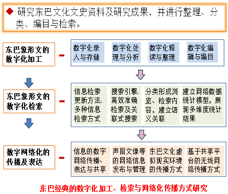 通過文理工大跨度學科交叉及國際合作的途徑,在發(fā)源地國家的中心文化城市首先研究構建面向全球東巴典籍的國際共享信息平臺,運用數(shù)字網(wǎng)絡化的現(xiàn)代信息科技手段進行世界記憶遺產-東巴經典文化信息的獲取、處理、存儲及傳播。