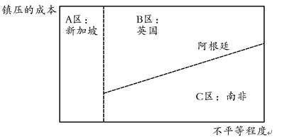 為了解釋這些不同的政治發(fā)展道路,阿塞莫格魯從社會結(jié)構(gòu)轉(zhuǎn)向經(jīng)濟結(jié)構(gòu)分析。他將社會分為精英與大眾兩大群體,這兩大群體實際上也是富人和窮人的分野。他認為,在民主體制下,社會政策由大眾(窮人)決定,因為大眾(窮人)在人數(shù)上居多,而在非民主體制下,社會政策由精英(富人)說了算,[10]因此,“經(jīng)濟起源論”必須要解決問題就轉(zhuǎn)化為:精英(富人)為什么會選擇對他們不利的民主制度呢?阿塞莫格魯認為,大眾會以各種手段威脅精英,精英也借助鎮(zhèn)壓或政變等手段確保有利于其利益的政治制度,民主實際上只能是被逼迫出來的:當(dāng)不平等的程度較低時,大眾(窮人)對現(xiàn)狀比較滿意,制度變遷(民主化)的壓力較小,精英(富人)可以在沒有鎮(zhèn)壓的情況下維持非民主政體(圖1-1中A區(qū)新加坡的位置);當(dāng)不平等程度升高后,革命就會成為一種威脅,而如果此時恰好面臨較高的鎮(zhèn)壓成本,精英(富人)往往就會放棄鎮(zhèn)壓轉(zhuǎn)向民主(圖1-1中B區(qū)英國所處的位置);當(dāng)不平等極為嚴重,從而使革命構(gòu)成對非民主政體的挑戰(zhàn),與此同時鎮(zhèn)壓成本卻非常低時,精英(富人)就會有充足的動力來鎮(zhèn)壓革命與反抗,從而長期維持非民主政體(圖1-1C區(qū)南非的位置)。[11]