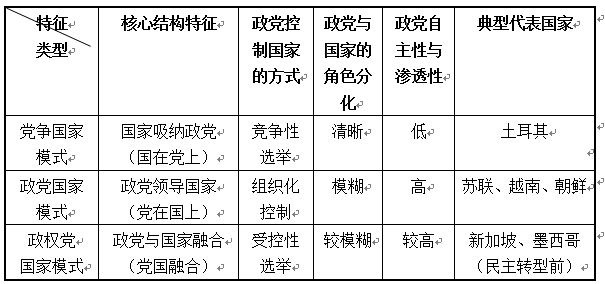 類型 核心結(jié)構(gòu)特征 政黨控制國家的方式 政黨與國家的角色分化 政黨自主性與滲透性 典型代表國家