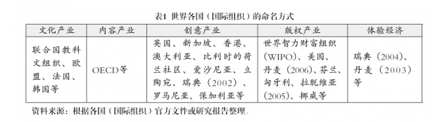 世界各國、地區(qū)和國際組織對文化產(chǎn)業(yè)的稱謂并不一樣,除了上面提到的文化產(chǎn)業(yè)、創(chuàng)意產(chǎn)業(yè)、文化創(chuàng)意產(chǎn)業(yè)外,還有內容產(chǎn)業(yè)、體驗經(jīng)濟、版權產(chǎn)業(yè)(美國除了使用創(chuàng)意產(chǎn)業(yè)、文化產(chǎn)業(yè)外,開始更多地使用“版權產(chǎn)業(yè)”的概念,以強調“版權”對文化產(chǎn)業(yè)的關鍵作用)等名稱(見表1)。本文這一部分,將對這些名詞進行梳理和分析。