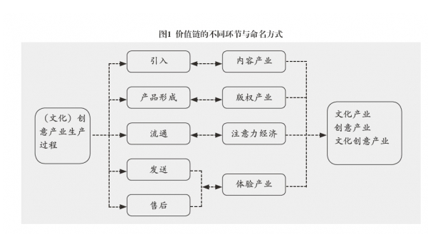 根據(jù)對文化產(chǎn)業(yè)生產(chǎn)五個階段的劃分,可以看出在不同階段其側重點不同。引入階段,側重于文化內容的挖掘,是“原料”投入的過程,將這一階段看作產(chǎn)業(yè)核心的人將其命名為內容產(chǎn)業(yè)。產(chǎn)品形成過程凝結了眾多擁有不同技能人員的創(chuàng)意勞動,因而也形成了產(chǎn)品的版權核心,將這一環(huán)節(jié)看作產(chǎn)業(yè)核心的人將其命名為版權產(chǎn)業(yè)。流通是一個產(chǎn)品傳播的過程,通過這一過程吸引消費者的注意力和眼球,為下一步的發(fā)送做必要準備,所以這一環(huán)節(jié)可稱為注意力經(jīng)濟。最后,發(fā)送和售后是將產(chǎn)品交給消費者的過程以及聽取反饋的過程,這個過程帶給消費者的是一種體驗,因而可稱作體驗產(chǎn)業(yè)。同樣是由于側重點的不同,將文化內容看作這個產(chǎn)業(yè)核心的人,將其命名為文化產(chǎn)業(yè)。將創(chuàng)意過程看做產(chǎn)業(yè)核心的人則將其命名為創(chuàng)意產(chǎn)業(yè),而文化創(chuàng)意產(chǎn)業(yè)是二者的折中,但在價值鏈這個分析框架下,筆者認為這三個詞的含義應該是相同的。