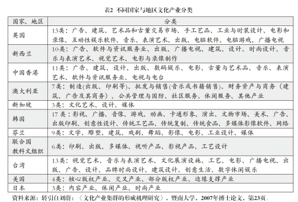 不同國家、地區(qū)對文化產(chǎn)業(yè)的分類。各個國家、地區(qū)及國際組織對文化產(chǎn)業(yè)的分類是不同的(見表2),而且不同時期也有一些變化。例如,英國在1991年將創(chuàng)意產(chǎn)業(yè)歸為文字創(chuàng)造、視覺藝術、舞臺美術、音樂、攝影、時裝6類,到1997年又增至13類,范圍擴大為廣告、建筑、美術和古董市場、手工藝、設計、時尚、電影、互動休閑軟件、音樂、表演藝術、出版、電腦軟件、電視和廣播。