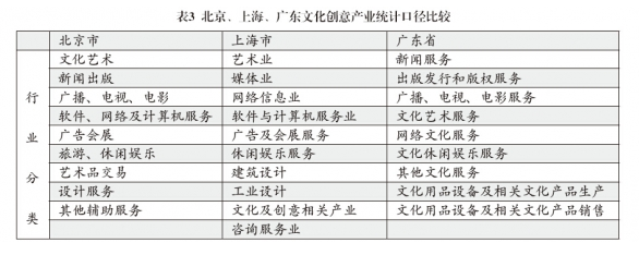 北京、上海、廣東在文化創(chuàng)意產(chǎn)業(yè)統(tǒng)計口徑上略有不同。北京將文化創(chuàng)意產(chǎn)業(yè)分為9大類,上海分為10大類,廣東省分為9大類(見表3)。在行業(yè)分類上北京是根據(jù)《北京市文化創(chuàng)意產(chǎn)業(yè)分類目錄》進行統(tǒng)計;上海是根據(jù)《上海市文化創(chuàng)意產(chǎn)業(yè)分類目錄》進行統(tǒng)計;廣東是根據(jù)國家統(tǒng)計局印發(fā)的《文化及相關產(chǎn)業(yè)分類》進行統(tǒng)計。從行業(yè)大類上比較,上海比北京多出了“咨詢服務業(yè)”和工業(yè)設計業(yè);北京比廣東多出了“設計服務業(yè)”和“軟件及計算機服務業(yè)”。