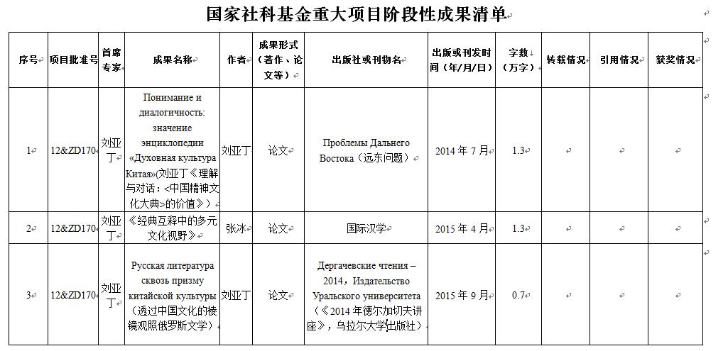15.“俄羅斯《中國精神文化大典》中文翻譯工程”首席專家劉亞丁教授主編的《肖洛霍夫?qū)W術(shù)史研究》和《肖洛霍夫研究》出版。劉亞丁教授主持的國家社科基金項目“肖洛霍夫研究史”和結(jié)項時均被評為“優(yōu)”,其最終成果《肖洛霍夫?qū)W術(shù)史研究》和《肖洛霍夫研究文集》于2014年出版!洞蟮洹贩g課題組子項目負責(zé)人李志強教授、課題組成員池濟敏副教授,黑龍江大學(xué)榮潔教授、川大羅悌倫教授、邱曉林副教授、寧虹教授、西安財經(jīng)學(xué)院劉祥文副教授等參加了課題研究、寫作和翻譯工作。2015年12月24日中國社會科學(xué)院舉行2014年度創(chuàng)新工程重大科研成果發(fā)布會,劉亞丁教授主持完成的《肖洛霍夫?qū)W術(shù)史研究》和《肖洛霍夫研究文集》,作為“外國文學(xué)學(xué)術(shù)史研究工程”的成果受到推薦。中央電視臺“新聞聯(lián)播”、《光明日報》予以報道。在主持肖洛霍夫課題研究期間,劉亞丁教授2011年應(yīng)邀出席俄羅斯國立肖洛霍夫博物館保護區(qū)(ГЗМШ)主辦的肖洛霍夫國際學(xué)術(shù)會議,做題為“《一個人的遭遇》:現(xiàn)實主義或象征主義”的大會發(fā)言。該機構(gòu)的院刊《維申斯克學(xué)報》連續(xù)3期發(fā)表劉亞丁教授的學(xué)術(shù)論文。俄羅斯《肖洛霍夫世界》雜志2015年第3期發(fā)表劉亞丁教授的《1980年代末1990年代初肖洛霍夫的創(chuàng)作和個性在蘇/俄的接受》。2012年俄羅斯出版德沃利亞申主編的《肖洛霍夫百科全書》稱贊劉亞丁教授的研究:“魯迅、戈寶權(quán)開創(chuàng)的中國肖洛霍夫?qū)W獲得了孫美玲、李樹森和劉亞丁等才華卓越的繼承人”,并引用他發(fā)表的論文和著作。