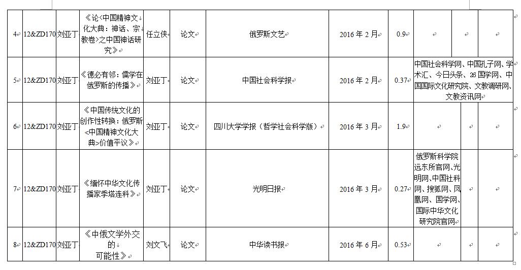 13.劉文飛(子項目負責(zé)人)《中俄文學(xué)外交的可能性》,《中華讀書報》,2016年6月29日;緝(nèi)容:回顧了中俄關(guān)系的歷史過程,追溯了兩國文學(xué)交往的歷史,論證了中俄文學(xué)交往的必要性。主要觀點:1)在中國進入盛世的今天,一方面,我們要下大力氣加強文化建設(shè),繁榮我們的文學(xué),讓我們的文學(xué)和文化盡早發(fā)揮與中國大國地位相稱的國際影響;另一方面,我們在文學(xué)、文化領(lǐng)域也要像在經(jīng)濟、貿(mào)易領(lǐng)域一樣,繼續(xù)保持高度的開放態(tài)度,張開雙臂擁抱包括俄羅斯文學(xué)在內(nèi)的一切優(yōu)良的、有益的外國文化。2)俄羅斯最好的東西不是石油、天然氣和軍火,而是文學(xué)。3)國人的“俄羅斯情結(jié)”還是應(yīng)該得到某種呵護,甚至鼓勵,因為,一方面,這畢竟是中俄兩國關(guān)系史中的一座路標(biāo),兩國戰(zhàn)略伙伴關(guān)系的一塊基石;另一方面,“俄羅斯文學(xué)情結(jié)”的存在客觀上有助于提升中國受眾的文化素質(zhì),同時也能為“中國文學(xué)情結(jié)”將來在世界其他國家的興起提供某種借鑒和參照。學(xué)術(shù)價值:將中俄的文學(xué)交往置于中俄國家關(guān)系的大局中加以觀照,頗有啟發(fā)。社會影響:劉文飛教授是中國俄羅斯文學(xué)研究會會長,本文的為中俄的一項雙邊活動而寫的。2016年6月29日,我國《光明日報》和俄羅斯塔斯社在2016年“中俄媒體年”框架內(nèi)共同舉辦的“在中國最有影響的十部俄羅斯文學(xué)作品”和“在俄羅斯最有影響的十部中國文學(xué)作品”評選活動正式啟動,本文正為此活動而寫的,對中俄讀書界的互動會產(chǎn)生積極影響。