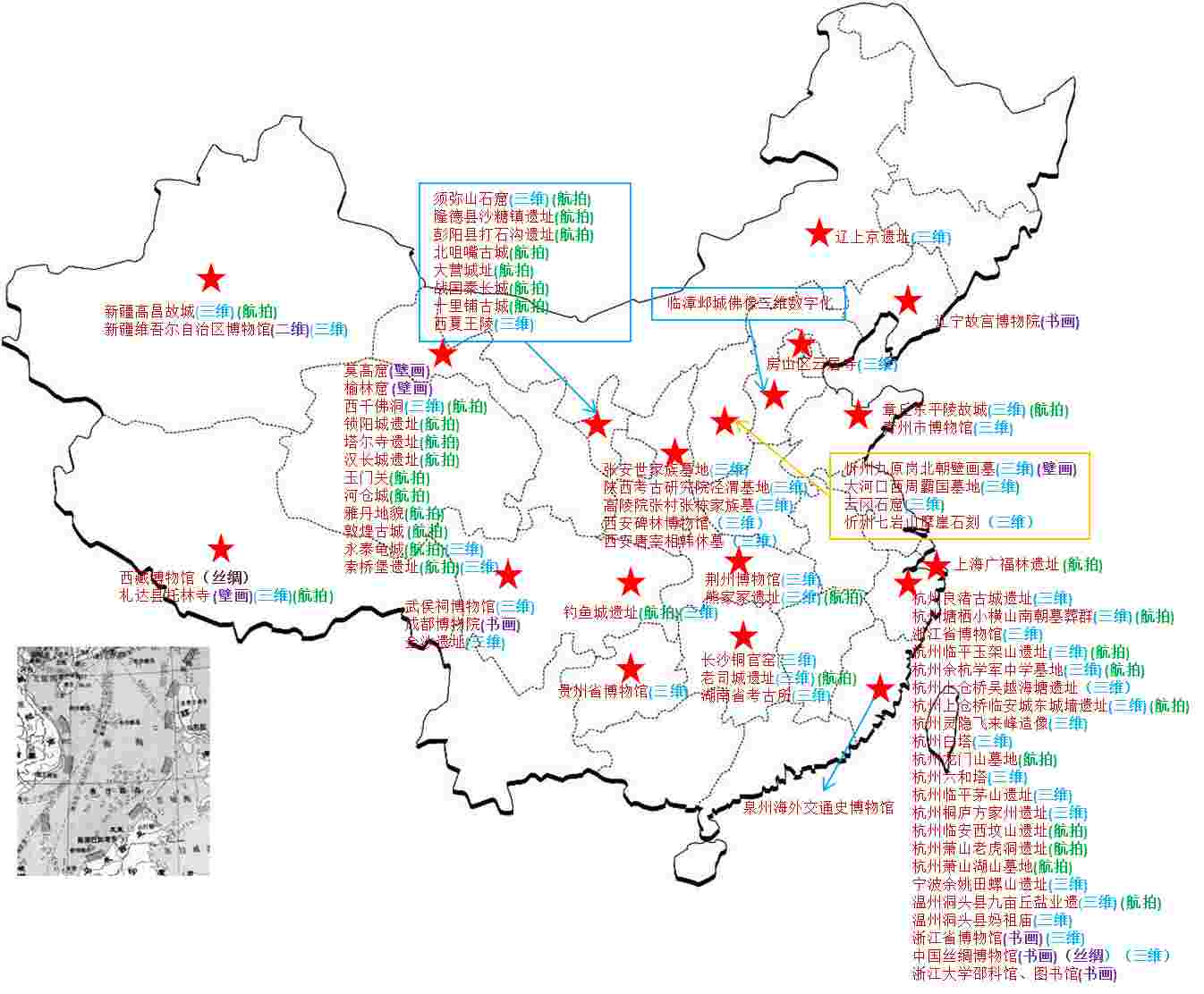 在本課題進(jìn)行的2012年至今,本課題承擔(dān)的主要機(jī)構(gòu)浙江大學(xué)文化遺產(chǎn)研究院,先后在19省進(jìn)行文物數(shù)字化工作(參見(jiàn)下圖)。主要的工作對(duì)象涵蓋了歷史時(shí)期考古領(lǐng)域的大遺址(重慶釣魚(yú)城,杭州吳越海塘遺址,杭州上倉(cāng)橋南宋臨安城址等)、出土佛像造像(青州龍興寺佛教窖藏考古數(shù)字化,鄴城出土造像數(shù)字化,遼上京出土造像數(shù)字化等)、石窟寺摩崖造像(北京房山云居寺石經(jīng)山雷音殿、杭州南宋飛來(lái)峰造像、山西忻州定襄七巖山居士山摩崖石刻等)、墓葬三維全息信息采集(山西忻州九原崗北朝墓地)和古代建筑的三維數(shù)字化考古調(diào)查(杭州閘口白塔,西藏托林寺建筑數(shù)字化全面調(diào)查,含壁畫(huà))。