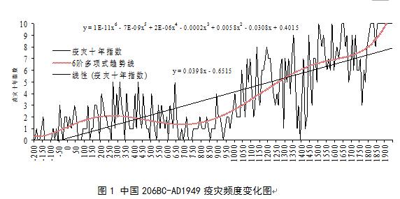 第二,弄清了中國疫災流行的時間變化趨勢。我們采用“十年疫災指數(shù)”,對自春秋戰(zhàn)國以來到新中國建立的2300多年的疫災流行規(guī)律進行了分析,得到了如圖1所示的“十年疫災指數(shù)”變化趨勢圖,取得了一些重要結(jié)論:中國是一個多疫災的國度,魏晉南北朝時期和宋元明清時期是我國歷史時期的兩個疫災高峰期;寒冷時期疫災相對頻發(fā),溫暖期疫災相對稀少;總體上疫災越來越頻繁,疫災頻度具有長期上升趨勢。