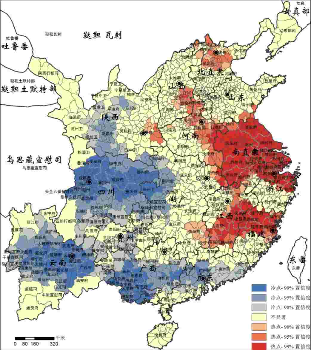 長江三角洲地區(qū)和開封府是當時全國一級的疫災中心, 前者為經(jīng)濟富庶區(qū),后者為都城所在地, 它們之所以成為疫災中心,都是因為它們擁有最高的人口密度和最高的人口流動性。 |