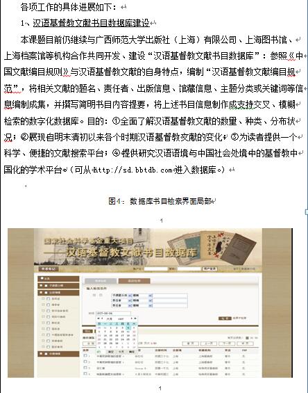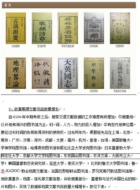 本課題目標(biāo)之一是建設(shè)基礎(chǔ)性的大型漢語基督教文獻(xiàn)數(shù)據(jù)資料數(shù)據(jù)庫。調(diào)查研究所獲新的數(shù)據(jù)資料都及時同步,嚴(yán)格按照書目文獻(xiàn)數(shù)據(jù)庫對數(shù)據(jù)的要求,通過輸入數(shù)據(jù)和三審制度進(jìn)入數(shù)據(jù)庫。目前入庫漢語文獻(xiàn)書目已達(dá) 17712 條,比前次中期評估增加7181條。同時新增全文數(shù)據(jù)約300余種,270300余頁。(詳見本表第7頁。)