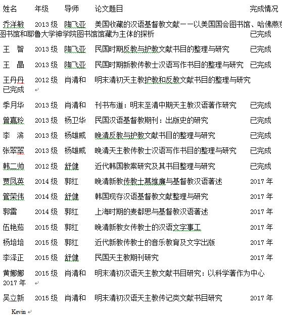 本項目計劃搜集漢語基督教文獻(xiàn)書目與研究工作需要非常龐大的工作量。項目評審專家從一開始建議導(dǎo)師要帶領(lǐng)學(xué)生一起參與收集與研究,在實踐中培養(yǎng)研究生的調(diào)查和動手能力,來實質(zhì)性的推進(jìn)項目。因此,項目組自啟動以來,邀請和鼓勵各位項目參與者指導(dǎo)的研究生參與工作。他們不僅在導(dǎo)師帶領(lǐng)下在國內(nèi)外收集漢語文獻(xiàn)資料,也在這一過程中根據(jù)自己接觸資料的基礎(chǔ),在導(dǎo)師們的通盤籌劃下發(fā)現(xiàn)自己感興趣的問題作為專題論文或碩士論文的選題,項目組則給予必要的經(jīng)費支持,使研究生們能將書目文獻(xiàn)的收集與自身研究結(jié)合起來,在占有各種資料的基礎(chǔ)上做出有創(chuàng)新性的專題論文或者碩士論文。這些研究論文的特點一是題目容量比較大,通常是對某個時期天主教、新教某個方面漢語文獻(xiàn)的系統(tǒng)考察,描述其形成、分布及發(fā)展的特點,如“明末清初天主教護(hù)教和反教文獻(xiàn)書目的整理與研究”、“晚清反教與護(hù)教文獻(xiàn)書目的整理與研究(天主教,新教)”、“民國時期反教與護(hù)教文獻(xiàn)書目的整理與研究”等,這就把整個大項目包括的明末清初到民國時期的反教與護(hù)教文獻(xiàn)的狀況系統(tǒng)地呈現(xiàn)了出來,有很大的文獻(xiàn)參考的意義;二是涉及到本項目探索的新問題,如“美國漢語基督教文獻(xiàn)書目的整理與