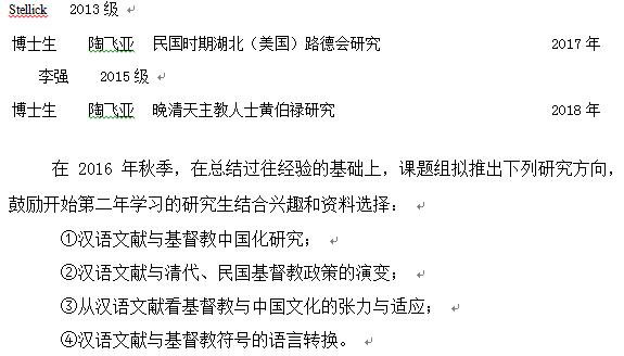 學(xué)出版社審核,待出版。在文獻(xiàn)研究方面,本方向已經(jīng)指導(dǎo)四名碩士生分別就“民國漢語基督教期刊”、“民國反教護(hù)教文獻(xiàn)”、“民國傳教士漢語著作”、“美國館藏漢語基督教文獻(xiàn)”分別撰寫碩士論文,已經(jīng)于2016年6月順利完成,另有4位研究生正在就民國本土基督徒漢語著述、民國漢語基督教文獻(xiàn)出版?zhèn)案研究等展開深入探討,擬結(jié)合各位參與同仁的研究,完成對民國漢語基督教文獻(xiàn)的整體描繪。