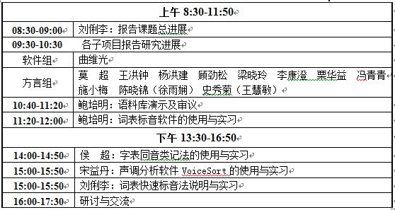 會議有三項(xiàng)議程:(1)匯報(bào)課題進(jìn)展與問題:(2)審議語料庫管理軟件;(3)培訓(xùn)4款語料轉(zhuǎn)寫軟件(方法)。