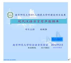 語料庫是儲存語料的數(shù)字化方式!艾F(xiàn)代漢語方言有聲詞匯庫”是本項(xiàng)目的前期成果,可在網(wǎng)上查詢使用,是一個(gè)兼顧語音的方言有聲詞匯庫。2016年取得國家計(jì)算機(jī)軟件著作權(quán)(登記號2016SR157089)。由兩期211重點(diǎn)學(xué)科建設(shè)項(xiàng)目資助建設(shè),10年中約40名碩士生、博士生參與研究。2008年建成單機(jī)光盤版,2012年改造成網(wǎng)絡(luò)版。經(jīng)多次語料復(fù)核后2015年11月上網(wǎng),更名為“現(xiàn)代漢語方言有聲數(shù)據(jù)庫”(該庫還有二期建設(shè)的其他語料,但未完成復(fù)核,未上網(wǎng),該庫目前只有詞匯)。下圖是其首頁。