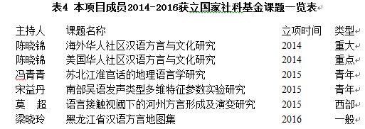 2014年該組成員獲得國家社科基金課題2項(xiàng)(重大與重點(diǎn)各一):海外華人社區(qū)漢語方言與文化研究(重大)、美國華人社區(qū)漢語方言與文化研究(重點(diǎn))。