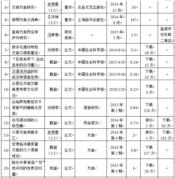 該組成員同時(shí)進(jìn)行本方言的相關(guān)研究,出版專著2部,發(fā)表論文21篇,完成3.3萬字的調(diào)研報(bào)告1份,該報(bào)告獲市社科聯(lián)科研二等獎。