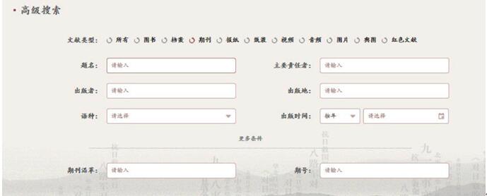 圖2按文獻(xiàn)不同分類的特點(diǎn)設(shè)計(jì)各具特色的高級檢索界面。