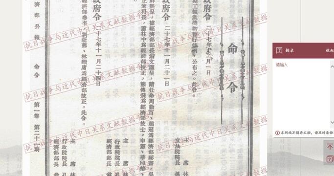 平臺試運(yùn)行兩周以來,已有注冊用戶數(shù)千名。我們期待著學(xué)術(shù)界朋友廣泛利用,并懇請?zhí)岢鰧氋F意見,以保障平臺建設(shè)健康發(fā)展。(“抗日戰(zhàn)爭與近代中日關(guān)系文獻(xiàn)數(shù)據(jù)平臺”課題組撰稿)