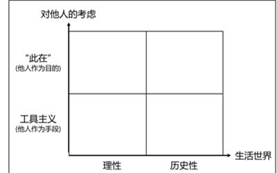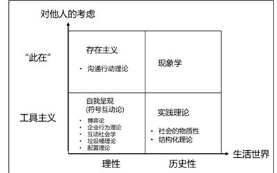 為了描述社交媒體的使用行為,從哲學(xué)角度提出圖1所示框架。橫軸表示人與世界的關(guān)系,用“生活世界”這一術(shù)語來說明。人與世界的關(guān)系或者是理性的或者是歷史性的?v軸表示人與他人的關(guān)系,用“對他人的考慮”來指代。“他人”可視為手段或目的。工具主義將“他人”視作手段,而“此在”思想將“他人”視作目的。