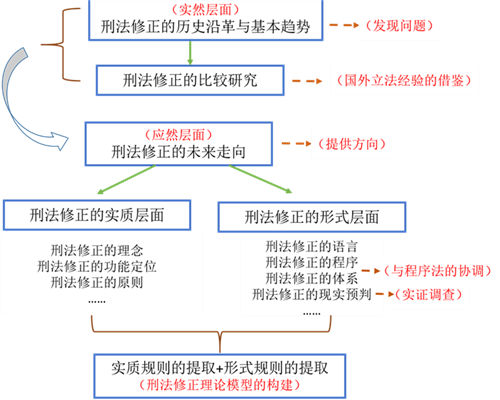 關(guān)于刑法修正的理論模型,主要從兩個維度切入,一是刑法修正的實然層面和應(yīng)然層面;二是刑法修正的形式層面和實質(zhì)層面。在首席專家的帶領(lǐng)下,課題組定期開展課題研討會議,課題基本按照研究計劃穩(wěn)步推進,不斷擴展深度和廣度。
