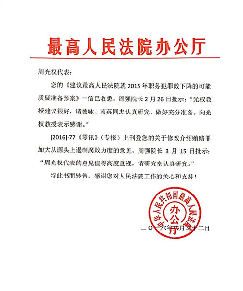 另外,課題組成員周光權(quán)教授關(guān)于介紹賄賂罪的立法建議得到最高人民法院周強院長批示,如下圖所示: