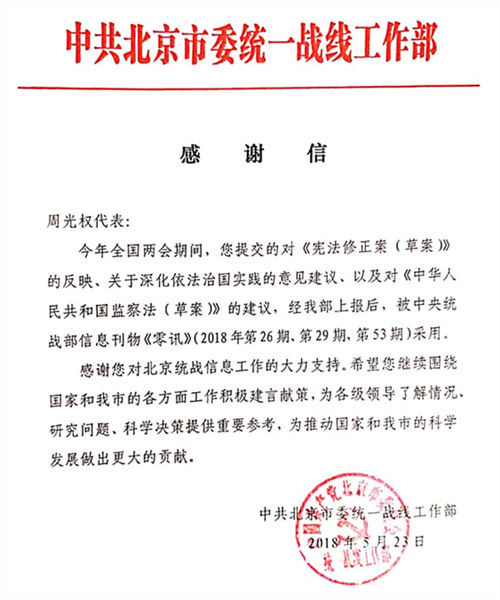 課題組成員周光權(quán)教授關(guān)于國家監(jiān)察法立法的建議被中央統(tǒng)戰(zhàn)部采納,如下圖所示: