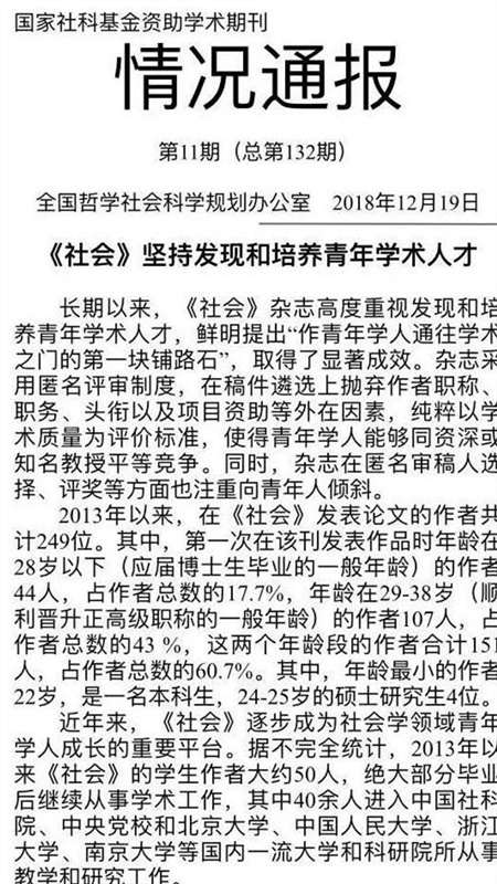 近日,全國哲學社會科學規(guī)劃辦公室主編的《國家社科基金資助學術期刊情況通報》2018年第11期報道了《社會》雜志堅持發(fā)現(xiàn)和培養(yǎng)青年學術人才的經(jīng)驗和成果,是對《社會》辦刊團隊的莫大鼓勵。