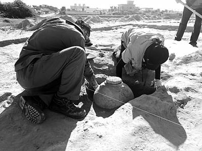 考古工作者正在發(fā)掘朱爾法陶罐 翟毅攝