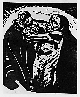 魯迅還特意把珂勒惠支的木刻《犧牲》投寄給《北斗》雜志,來(lái)表達(dá)他對(duì)柔石無(wú)言的紀(jì)念。這幅畫刻著一位瘦骨嶙峋的母親,悲哀地閉著眼睛,把她熟睡的孩子交出去,這位母親飽經(jīng)滄桑,悲哀而剛毅。在這木刻畫里,珂勒惠支寄寓了作為母親的巨大悲痛——?jiǎng)?chuàng)作這幅畫前不久,女畫家剛剛在一戰(zhàn)中失去了自己的長(zhǎng)子。兩年以后,《為了忘卻的記念》在《現(xiàn)代雜志》發(fā)表,后者為這篇文章配印的插圖就是這幅《犧牲》。今天,當(dāng)我們面對(duì)這幅木刻,似乎仍能聽到魯迅和珂勒惠支對(duì)扼殺年輕生命的黑暗世界所發(fā)出的無(wú)聲控訴。