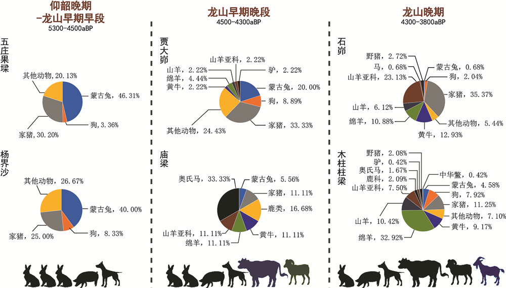通過動(dòng)物考古學(xué)研究發(fā)現(xiàn),在仰韶晚期的橫山楊界沙、靖邊五莊果墚1期和龍山早期廟二早段的橫山大古界、靖邊五莊果墚2期、佳縣喬家寨等遺址中,出土的動(dòng)物骨骼以野生動(dòng)物蒙古兔、狍子等為主,家養(yǎng)動(dòng)物主要是與農(nóng)業(yè)經(jīng)濟(jì)相關(guān)的動(dòng)物豬和狗,比例一般少于40%,沒有可以確認(rèn)的綿羊、山羊和家養(yǎng)普通牛。不同區(qū)域內(nèi)部動(dòng)物種類數(shù)量存在差異,黃土區(qū)的佳縣喬家寨遺址豬的數(shù)量明顯多于黃土沙漠過渡帶的同時(shí)期其他遺址。生業(yè)模式主要為粟黍種植、家豬飼養(yǎng)的農(nóng)業(yè)經(jīng)濟(jì)和狩獵采集,時(shí)間再向后推移到距今約4500—4300年的廟二晚段的橫山賈大峁、紅梁遺址及靖邊廟梁2期遺址中,發(fā)現(xiàn)了一定數(shù)量的家養(yǎng)普通牛和綿羊的骨骼。賈大峁遺址家養(yǎng)普通牛和綿羊僅占動(dòng)物總數(shù)的10%左右,更多地延續(xù)了仰韶晚期動(dòng)物遺存的特點(diǎn),即以家豬和蒙古兔為特征。靖邊廟梁2期和橫山紅梁遺址家養(yǎng)普通牛和綿羊已占動(dòng)物總數(shù)的30%左右。