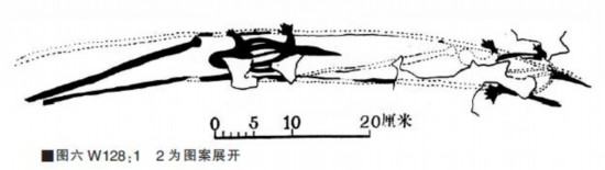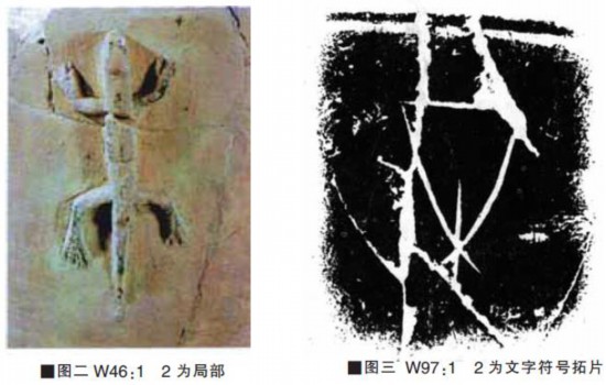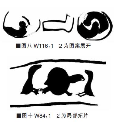”形。每一個前端都近橢圓形,為娃娃魚的頭部,似在大聲鳴叫;后端呈卷曲狀,尾部略尖,應(yīng)為娃娃魚的身軀;前端下方突出的部分應(yīng)為娃娃魚的前爪。整組圖案表現(xiàn)的應(yīng)是兩只頭部相對、身體彎曲的娃娃魚(圖七W10:1)。陶缸W116:1外壁的圖案中,除了“