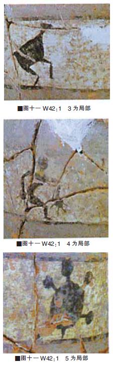 (二)“狩獵”圖。陶缸W42:1的彩繪圖案由圈點、鹿紋、龜紋和人物紋等元素組成。其中,人物圖像呈奔跑狀,雙臂前后擺幅,兩手五指叉開。龜?shù)乃淖愫皖^部伸出甲殼,作逃跑之狀。鹿頭部高昂,頸部挺立,四肢曲彈,向前疾跑。第二個和第五個圖案作“
