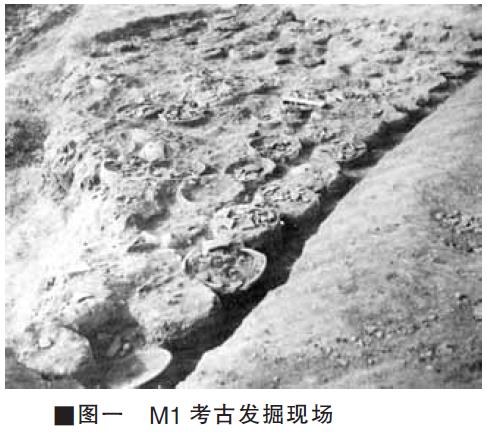 這座墓葬(編號M1)墓口長6.30米、寬3.50米,是目前我國發(fā)現(xiàn)的最早、最大的甕棺合葬墓。墓內(nèi)共出土甕棺136座,分13排,每排16座左右;各排內(nèi)部可觀察到3—5個成組集中的現(xiàn)象。其中,大墓已被近代水渠破壞掉了一部分,如果保存完整下葬規(guī)?蛇_(dá)200人。作為葬具的甕棺為泥質(zhì)紅陶大口缸,每個缸約五六十厘米高,有蓋,蓋和缸的口沿下都有3—5個鋬,以便上下扣合綁定,將人骨安放穩(wěn)妥。每個缸里安置一個人,頭骨置于中央,盆骨、四肢骨豎直靠在頭骨周圍,肋骨、脊椎骨等置于下部(圖一)。