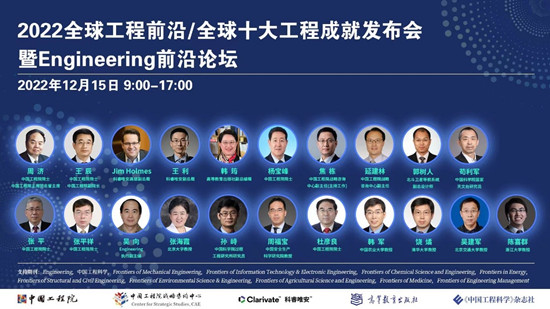 2022年12月15日,《全球工程前沿2022》報(bào)告發(fā)布會(huì)在線成功舉辦。中國(guó)工程院院主席團(tuán)名譽(yù)主席周濟(jì)院士、副院長(zhǎng)王辰院士出席會(huì)議并為報(bào)告在線揭幕。會(huì)議同步發(fā)布了Engineering“2022全球十大工程成就”。