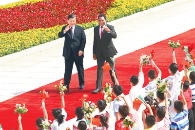 希奇萊馬抵達(dá)時(shí),禮兵列隊(duì)致敬。兩國(guó)元首登上檢閱臺(tái),軍樂(lè)團(tuán)奏中贊兩國(guó)國(guó)歌,天安門(mén)廣場(chǎng)鳴放21響禮炮。希奇萊馬在習(xí)近平陪同下檢閱中國(guó)人民解放軍儀仗隊(duì),并觀看分列式。