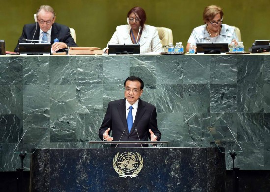 2016年9月21日,李克強(qiáng)同志在紐約聯(lián)合國總部出席第71屆聯(lián)合國大會以“可持續(xù)發(fā)展目標(biāo):共同努力改造我們的世界”為主題的一般性辯論并發(fā)表題為《攜手建設(shè)和平穩(wěn)定可持續(xù)發(fā)展的世界》的講話。