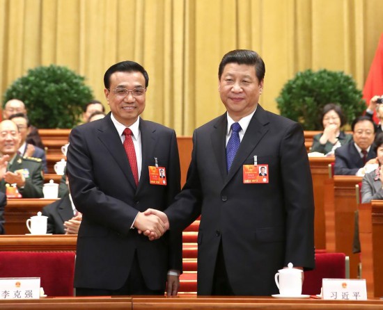 2013年3月15日,第十二屆全國人民代表大會第一次會議在北京人民大會堂舉行第五次全體會議。會議經(jīng)過投票表決,決定李克強(qiáng)為中華人民共和國國務(wù)院總理。這是習(xí)近平同志和李克強(qiáng)同志親切握手。