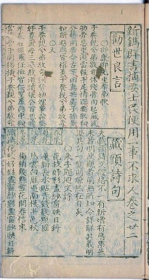 進(jìn)入明代,受社會(huì)勸善思潮的影響,明中后期日用類(lèi)書(shū)所刊載的民間倫理,一部分取材于前代及當(dāng)時(shí)流行的道德說(shuō)教,如多本日用類(lèi)書(shū)全文錄入了朱熹的《童蒙須知》,同時(shí)還摘錄了仿其體例、由明代彭東峨編寫(xiě)的《東峨彭先生示訓(xùn)》。后者分為“訓(xùn)讀歌”“訓(xùn)坐歌”“訓(xùn)言歌”“訓(xùn)食歌”“訓(xùn)字歌”“訓(xùn)揖歌”“訓(xùn)行歌”“訓(xùn)立歌”等篇,以歌謠形式對(duì)孩童的言、行、坐、立、食等外在行為和儀態(tài)作了詳細(xì)而通俗易懂的規(guī)范。還有一部分民間倫理內(nèi)容直接取自《明心寶鑒》《筆疇集》等在當(dāng)時(shí)廣為流行的道德勸善類(lèi)通俗讀物或具有休閑屬性的文人小品文,如《新板全補(bǔ)天下便用文林妙錦萬(wàn)寶全書(shū)》中《勸諭門(mén)》的“紫虛九宮誡諭心文”就是對(duì)《明心寶鑒》中“紫虛元君戒諭心文”的全文鈔錄!秳裰I門(mén)》中《名公格言》則從明初士人王達(dá)的《筆疇集》中摘錄了多條關(guān)于為人處世的道德格言,如“稠人廣坐之中不可極口議論,逞己之長(zhǎng)。非惟惹妬,抑亦傷人”。值得注意的是,這一時(shí)期日用類(lèi)書(shū)編纂者在鈔錄原文時(shí)已不再標(biāo)明出處,體現(xiàn)了其閱讀對(duì)象的庶民化及追求簡(jiǎn)單實(shí)用的出版傾向。