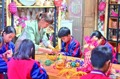 11月28日,在廣西岑溪市南渡中心小學(xué),老師在指導(dǎo)小學(xué)生練習(xí)當(dāng)?shù)胤沁z項(xiàng)目——竹芒編織技藝。新華社發(fā)