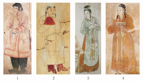 圖一 契丹服 1.內(nèi)蒙古阿魯科爾沁旗寶山M1遼墓 2.內(nèi)蒙古庫倫M7遼墓 3.河北宣化M5遼墓 4.內(nèi)蒙古庫倫M2遼墓 作者/供圖